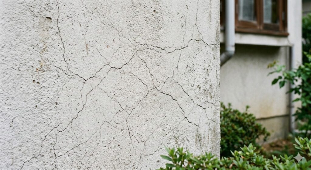 ひび割れがあるモルタルなどの湿式工法による外壁材は、その乾燥過程で水分の蒸発などにより収縮が起こり、それが原因となってひび割れが発生します。 モルタルとはモルタルとは、セメント・骨材(砂)・水を練り混ぜてつくる外壁材料のことで、ペースト状で施工性が良く、仕上材や目地材として多く用いられています。完全に乾燥・硬化させたあと、上から塗装をして仕上げますが、その乾燥過程で水分の蒸発などにより収縮が起こり、それが原因となってひび割れが発生しやすいという特性があります。塗膜の微細なヒビ割れや外壁自体のヒビ割れはありませんか? 微細なヒビでも時間がたつとそこからどんどん塗膜が剥がれていき悪化していきます。