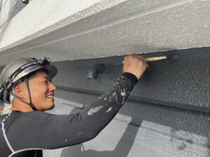 今回の現場は軒天と壁の塗料が別になるため細かな部分を刷毛を使って作業を行いました。