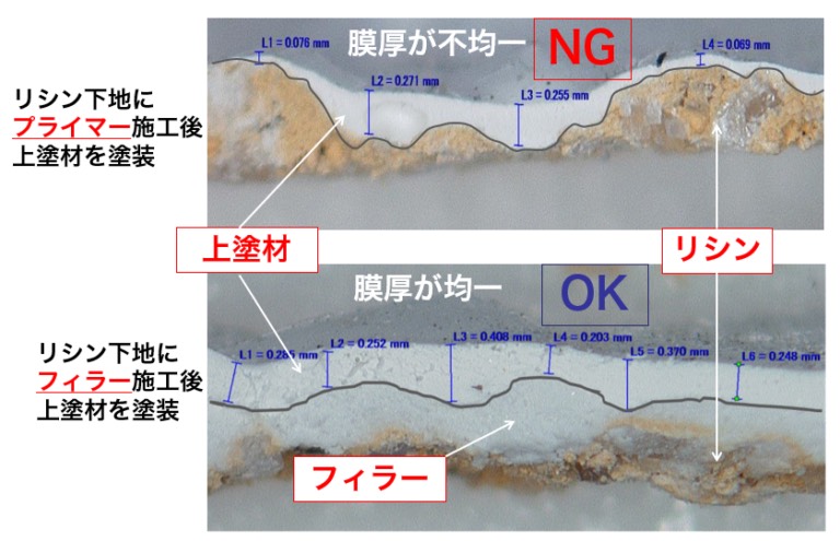 また凹凸部分を平滑にすることで、上塗りの膜圧に均一性を持たせることができ、より斑の少ない仕上がりにすることができます。