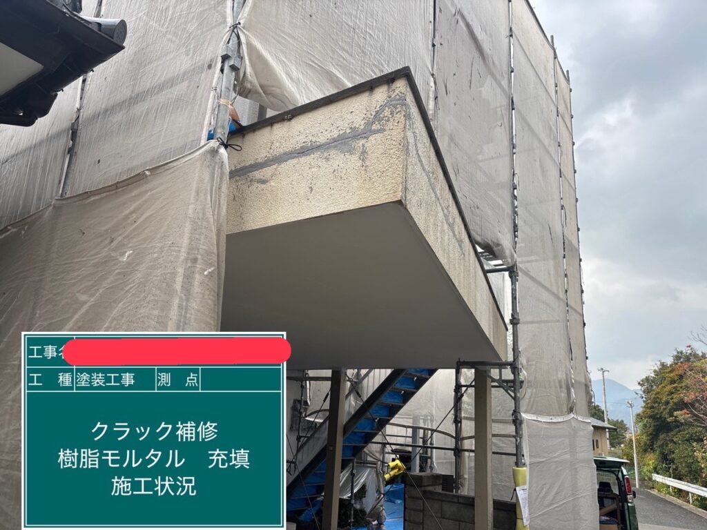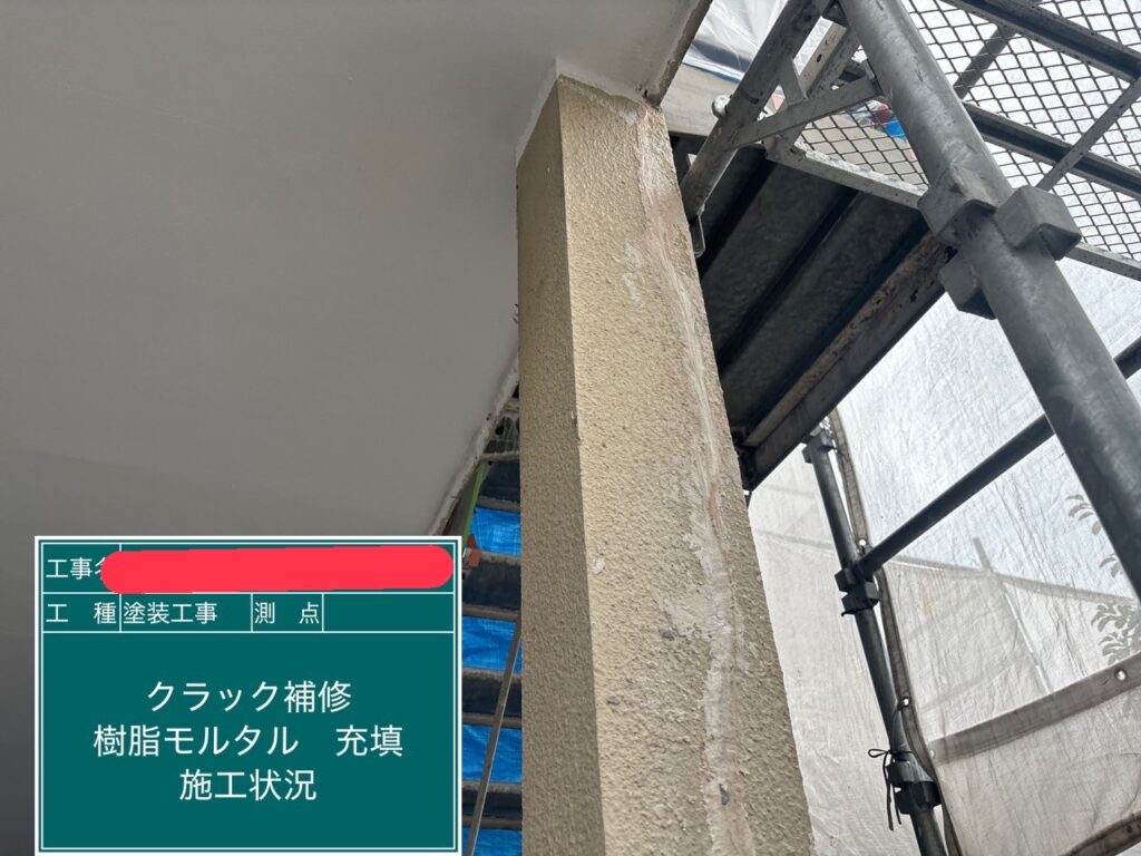 洗浄後は、モルタル特有のクラック(ひび割れ)補修を行います。幅のあるひびはシーリング材や補修材で埋め、細かなひびには下塗り材でカバーできるよう準備していきます。