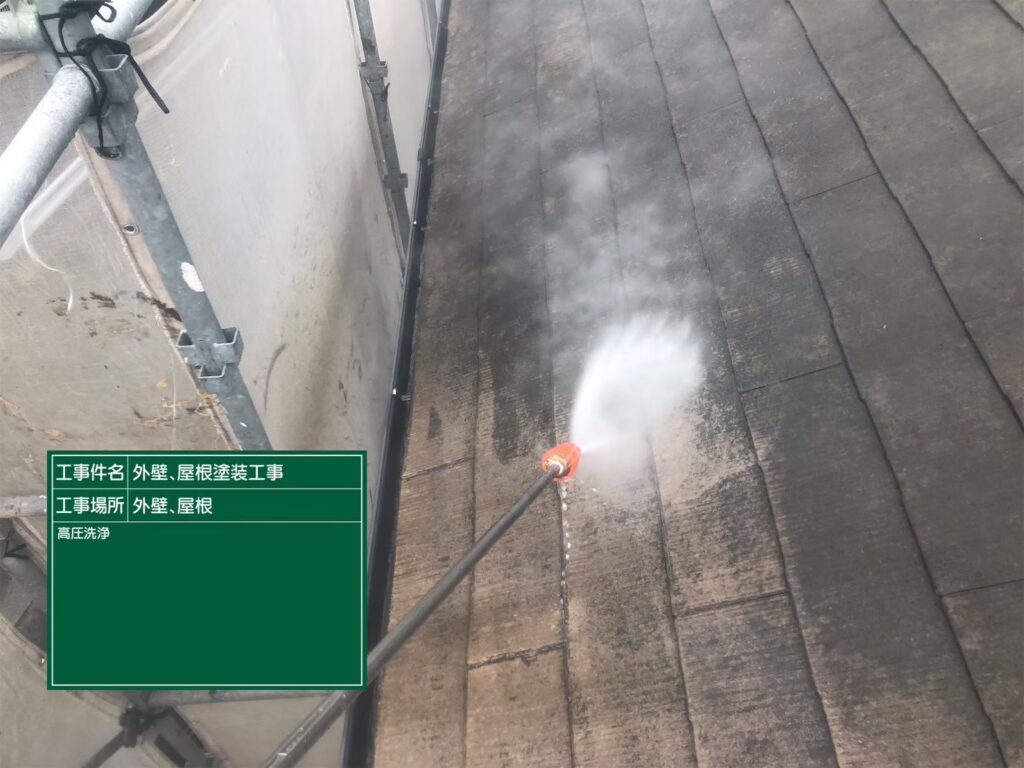 まずは、塗装前の高圧洗浄からスタートします。屋根には、長年の汚れ・苔・カビが付着していることが多く、そのまま塗料を塗ると密着せず剥がれの原因になります。そのため、専用の高圧洗浄機でしっかりと汚れを落としていきます。洗浄後は屋根材の状態を点検し、ひび割れや欠けがあれば補修を行います。
