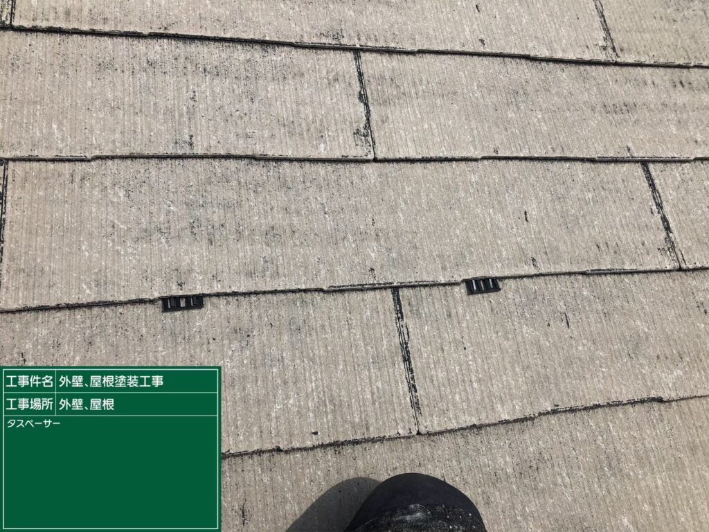 次に、屋根材の縁を確保するためのタスペーサーの挿入を行います。コロニアル屋根では、塗膜で隙間が塞がってしまうと雨水が排水できず雨漏りにつながる恐れがあるため、このタスペーサーという専用部材を入れることで通気と排水の道を確保します。これは見えない部分ですが、とても重要な工程です。