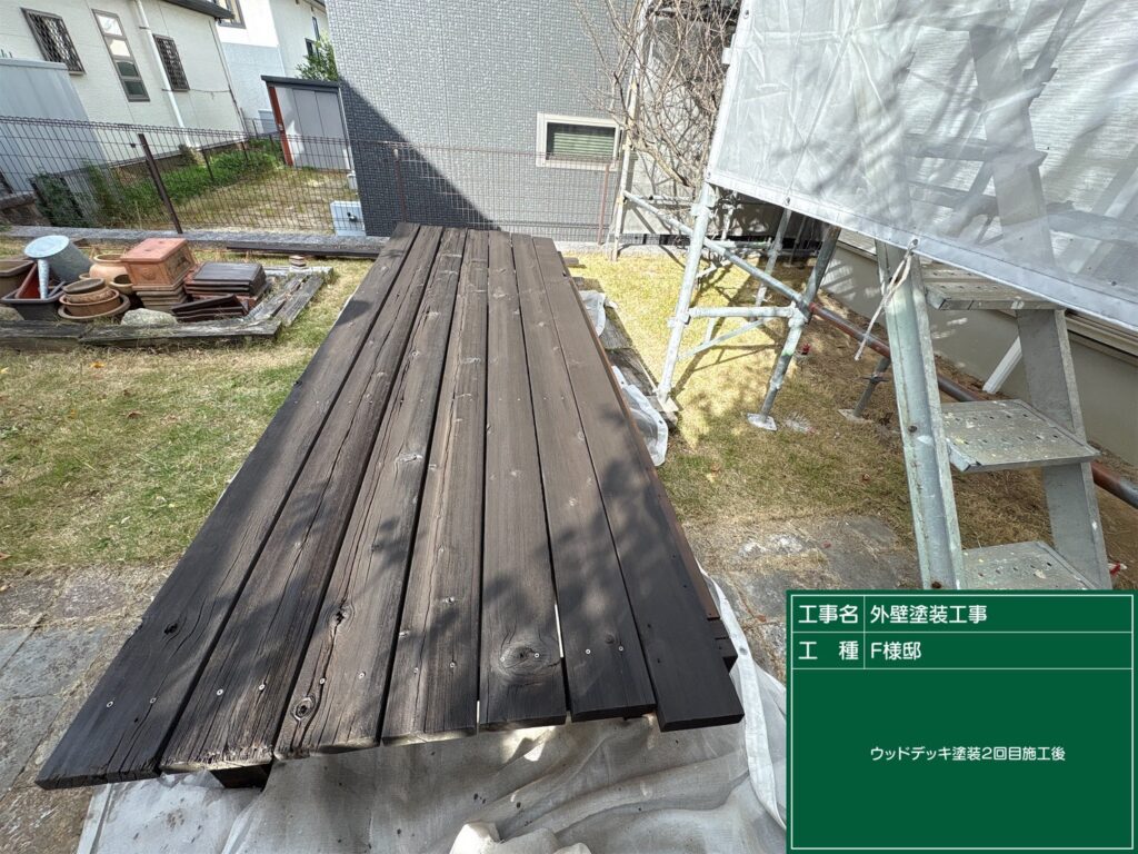 本日は北九州市小倉南区吉田の現場にて外壁塗装の作業が終わり最後にウッドデッキの塗装をおこないました。