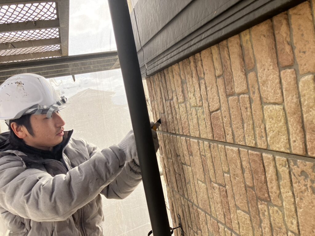 小倉南区にて竪樋裏の板間目地シーリング撤去を行いました。