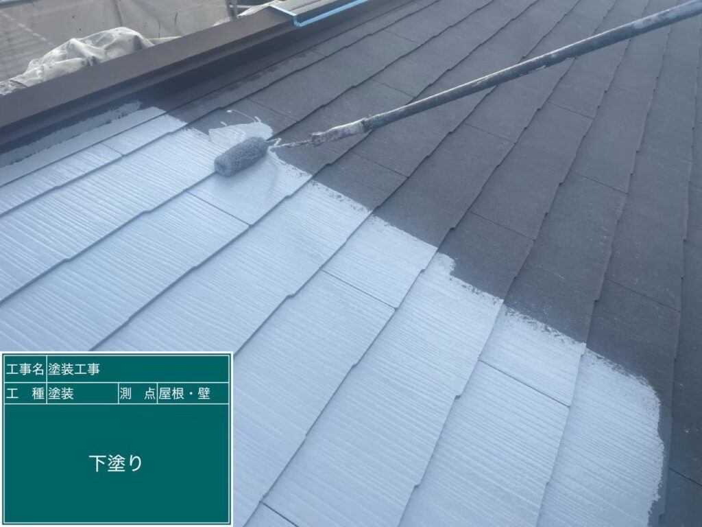 ローラーを転がすと、屋根材が塗料をグングン飲み込んでいく音が聞こえそうなほど。表面の毛羽立ちを抑え、明日塗る本番の塗料がしっかり食いつくための「強固な接着層」を作ります。