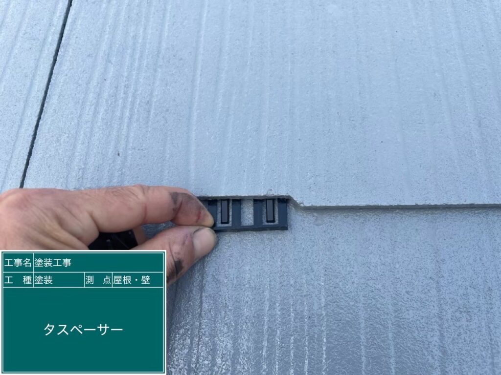 スレート屋根の隙間に「タスペーサー」という小さな部材を一つひとつ差し込んでいきます。