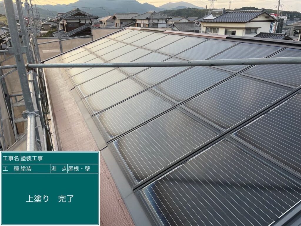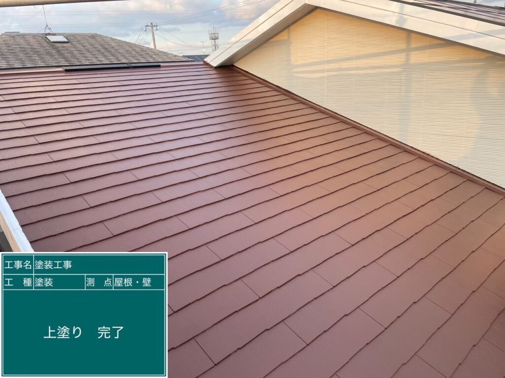 平らな面だけでなく、屋根材の継ぎ目や段差の部分も、刷毛とローラーを使い分けて塗り残しがないか目を光らせます。この段階で、これまでの色褪せた屋根の面影は完全になくなり、美しい発色が顔を出しました。