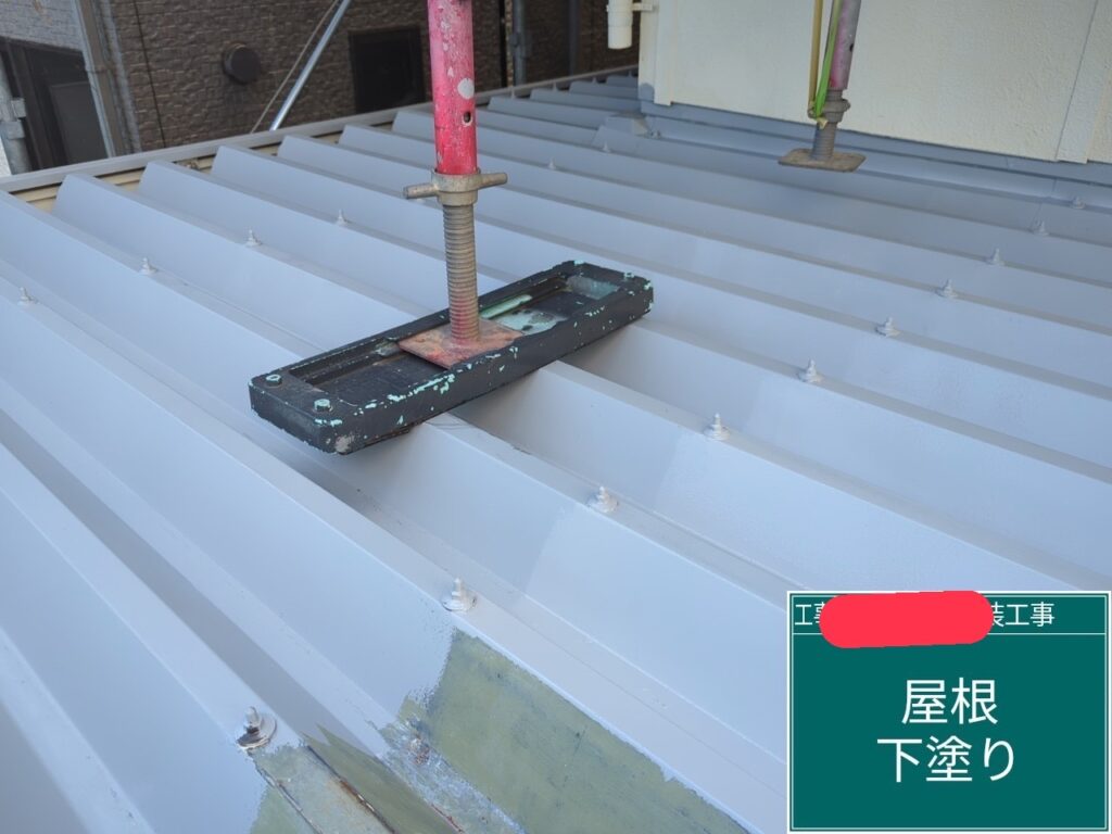 今回は、密着性に優れたエポキシ樹脂系の錆止めを使用しました。これが、次に塗るペンキと屋根材を強力につなぐ「接着剤」の役割も果たします。