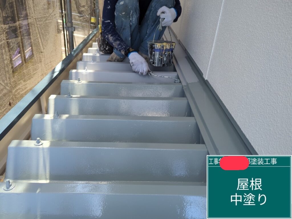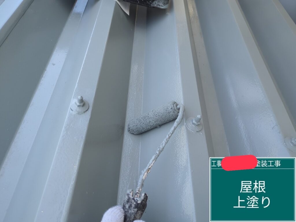 折板屋根特有の長い溝を、ローラーでリズムよく塗り進めていきます。塗りムラが出ないよう、常に一定の力加減で進めるのが職人のこだわりです。