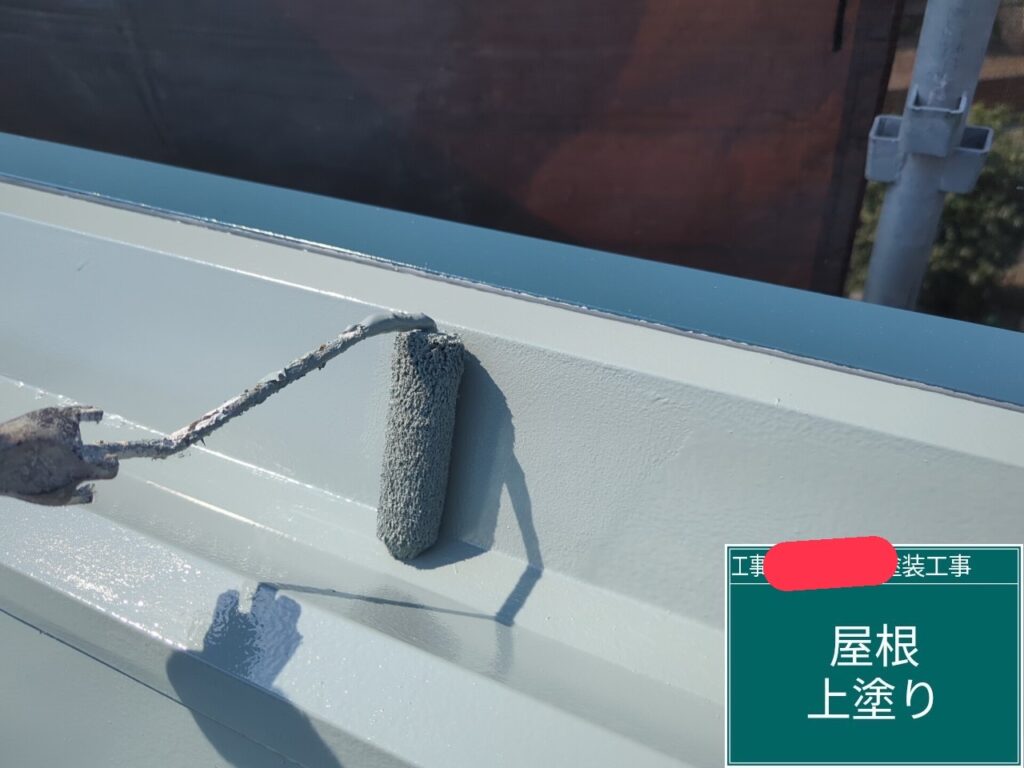 折板屋根特有の長い溝を、ローラーでリズムよく塗り進めていきます。塗りムラが出ないよう、常に一定の力加減で進めるのが職人のこだわりです。