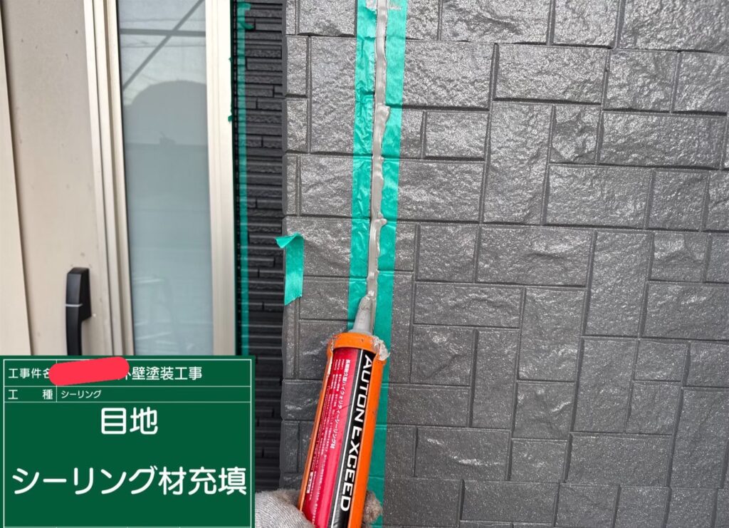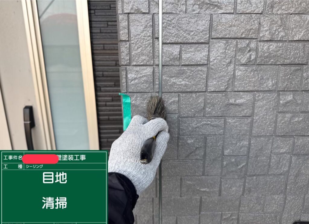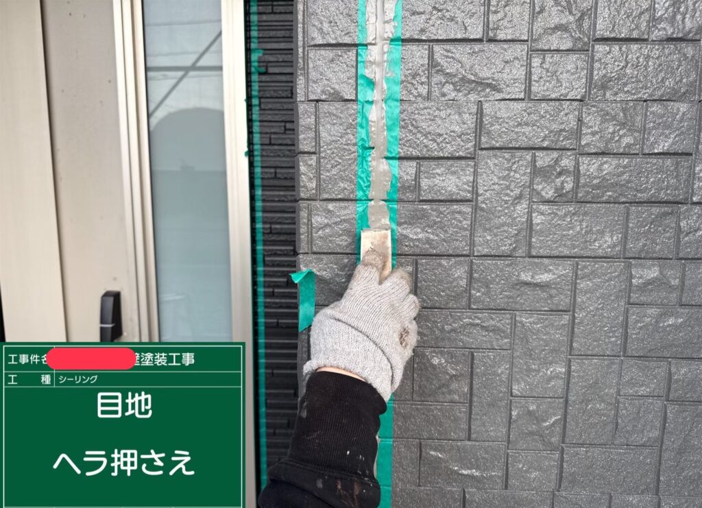 目地の両サイドにマスキングテープを貼っていくのですが、これが仕上がりの「美しさ」を左右します。1ミリのズレもなく、ビシッと真っ直ぐにテープを貼る。簡単そうに見えて、凹凸のある外壁に隙間なく貼るには指先の感覚が頼りです。このラインが曲がると、どんなに良い材料を使っても仕上がりが台無しになってしまいます。