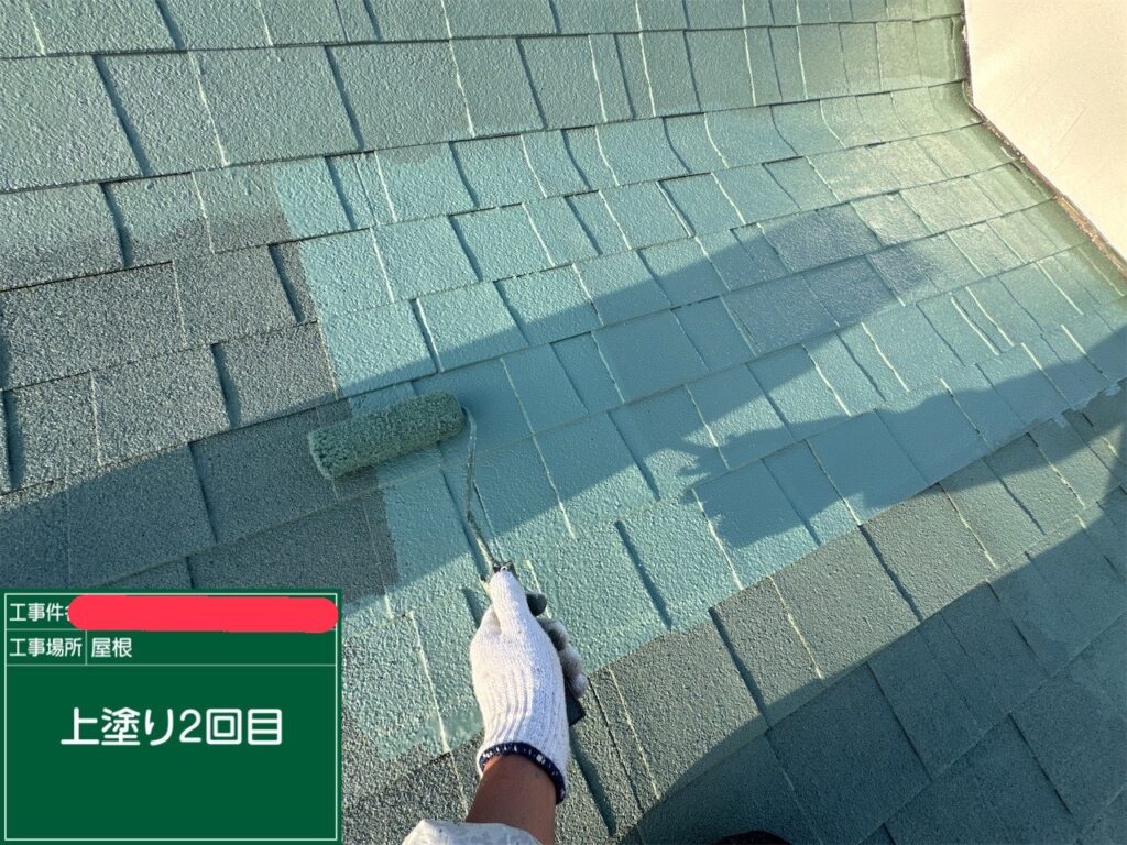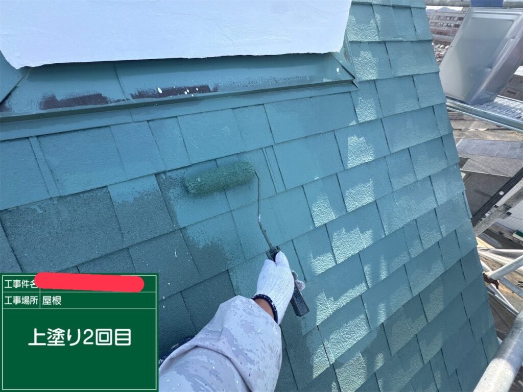 夕方には全ての面が塗り上がり、見違えるような落ち着いた屋根に仕上がる予定です。明日は付帯部(樋や破風)の仕上げ作業に移ります。