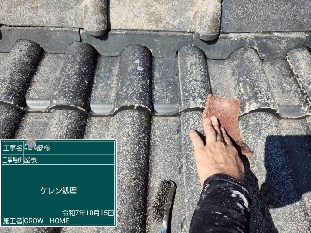 表面の錆を落とす為と表面に傷をつける事で塗料のくいつきを良くします。屋根 下塗り