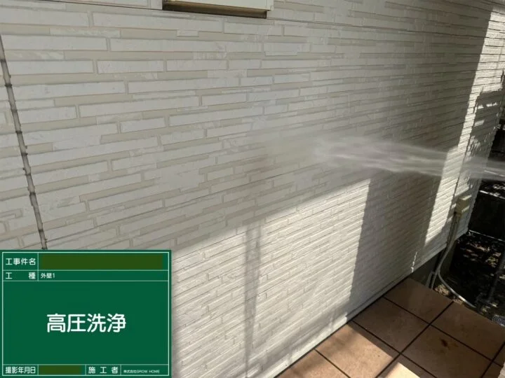 外壁洗浄では、外気の影響で付着した汚れやカビを高圧水流で一気に除去し、下地の状態を均一に整えます。塗装前の洗浄が不十分だと早期の剥離につながるため、凹凸部分も丁寧に洗い残しがないよう作業を進め、耐久性向上の準備をします。
