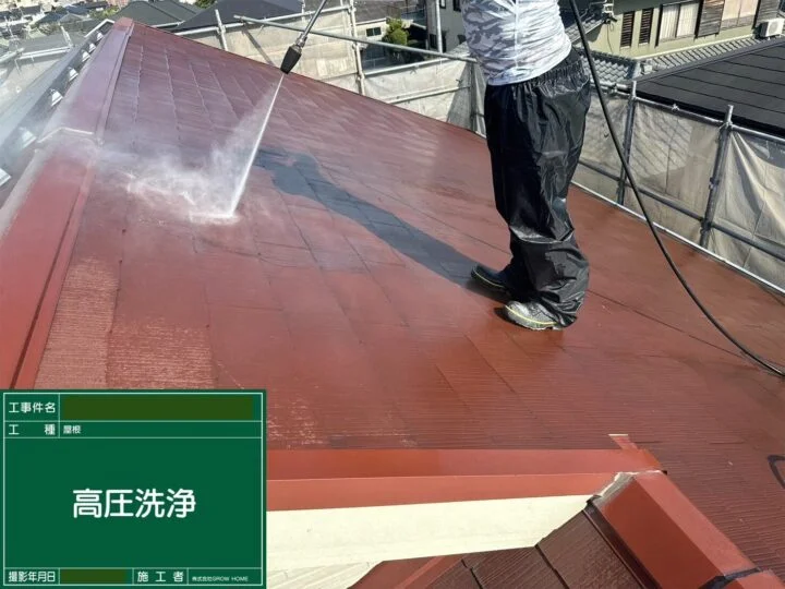 屋根部分は日射や風雨の影響を強く受け、汚れや苔が発生しやすいため、高圧洗浄で素材本来の状態に近づけます。汚れを残すと塗膜剥離の原因になるため、細部まで丁寧に洗い、塗装の耐久性を高める万全の下準備を行います。