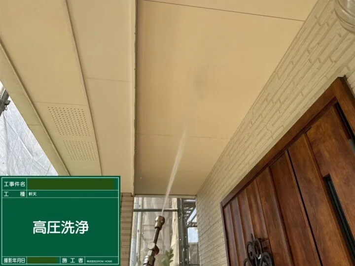 軒天はケイカル板などのボード材が使われていることが多く、高すぎる水圧は破損の原因になります。そのため圧力を抑え、軒天特有の粉塵やクモの巣、汚れを丁寧に洗い流しました。
