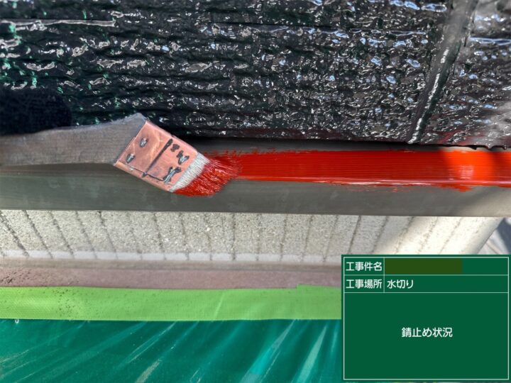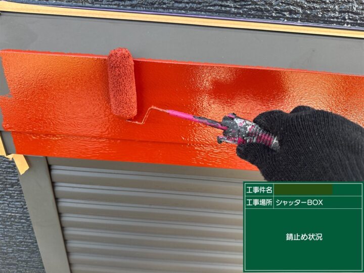 サビ止めを塗っていきます。錆止めを塗っていくことで先々の錆と錆だれを防止していきます。シャッターボックス 中塗り