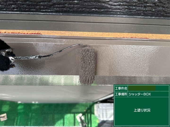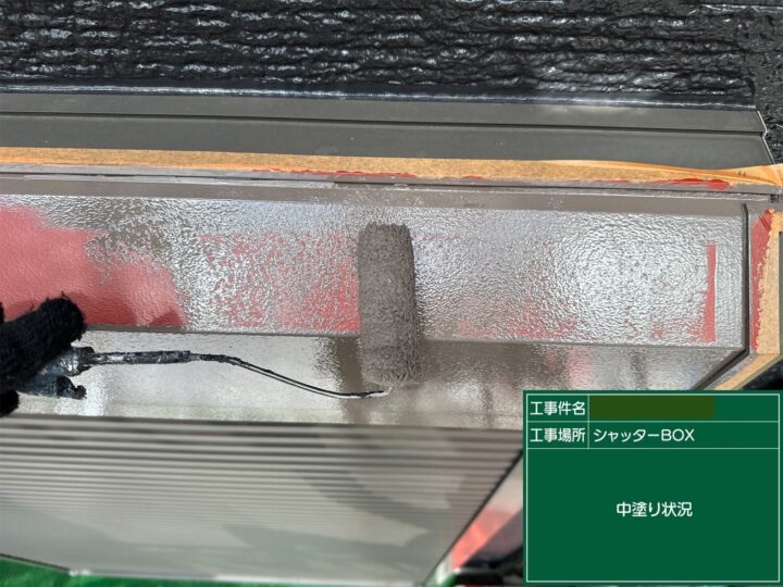 錆止め乾燥後、中塗りを行っていきます。シャッターボックス 上塗り