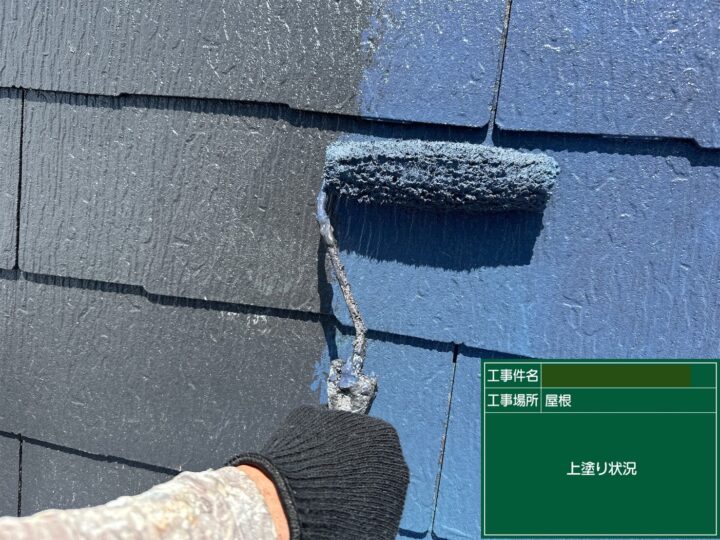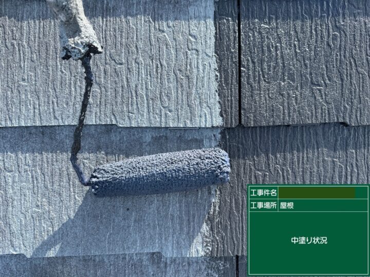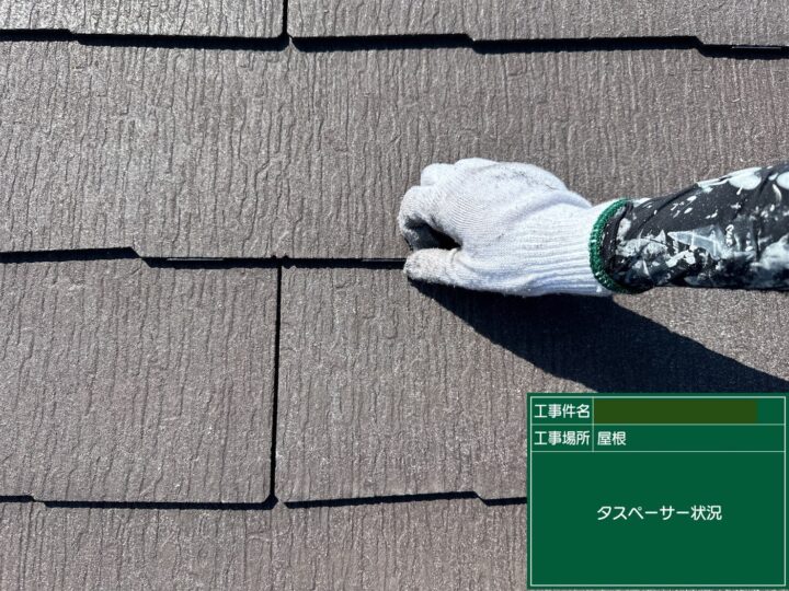 タスペーサーを差し込んでいきます。コロニアル屋根の場合は屋根と屋根が重なっている為、塗装をした際にどうしても隙間を塗料で塞いでしまいます。湿気を逃がす為と雨水の導線を確保する為に縁切り作業とタスペーサーを挿入していきます。屋根 中塗り