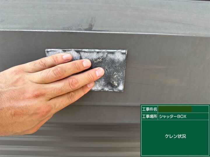 ケレン作業していきます。表面の錆を落とす為と表面に傷をつける事で塗料のくいつきを良くします。シャッターボックス 錆止め塗布